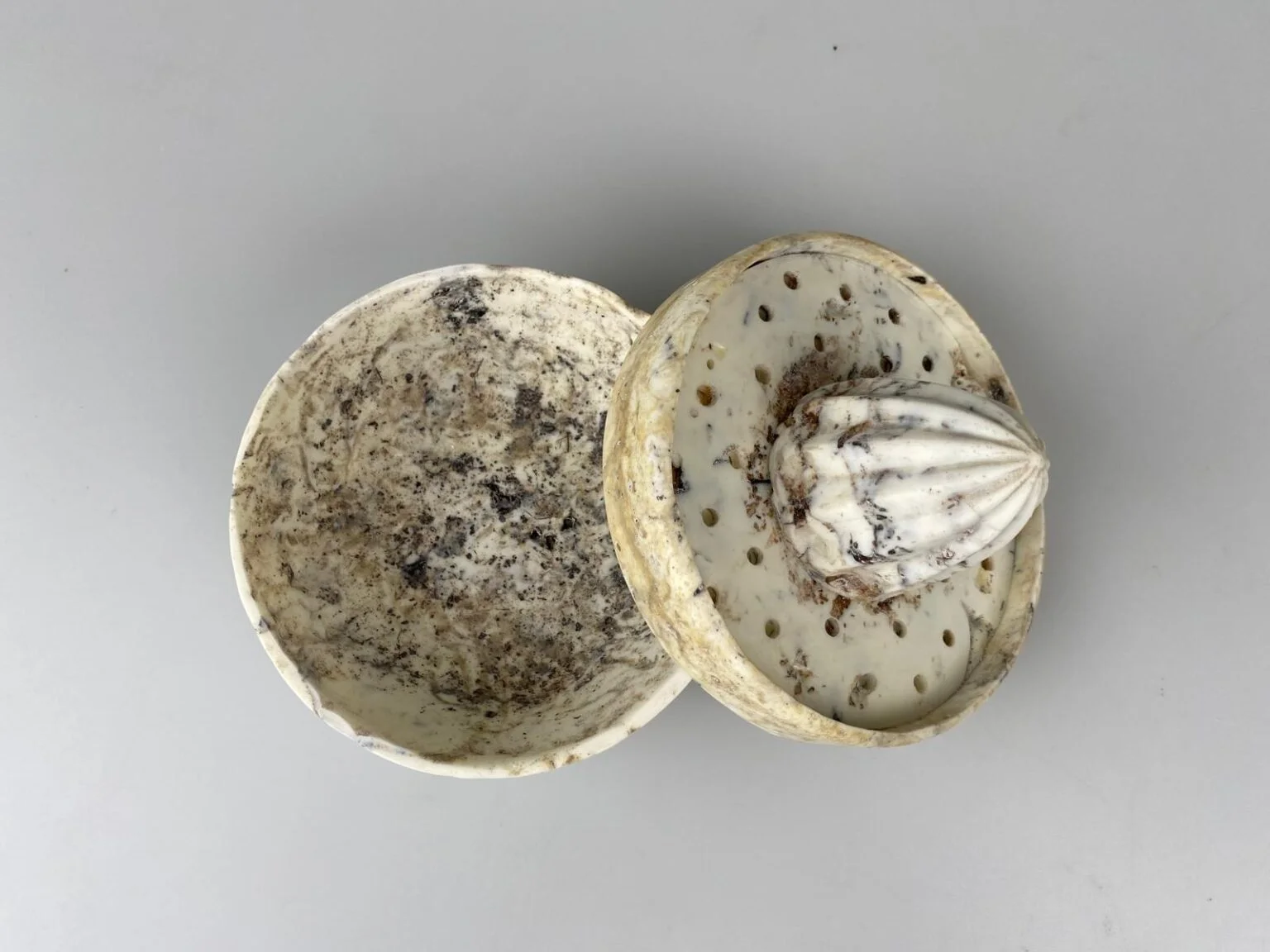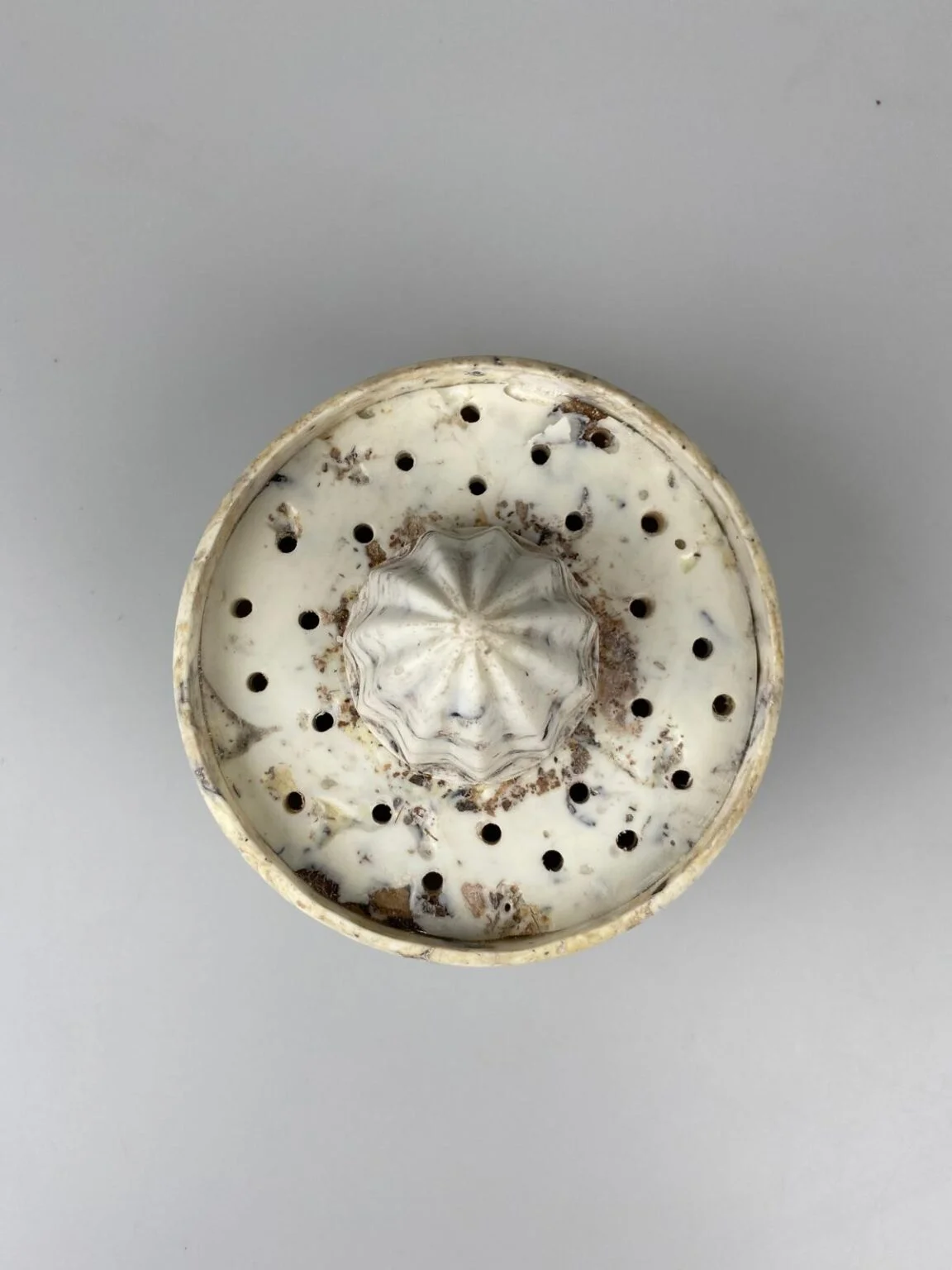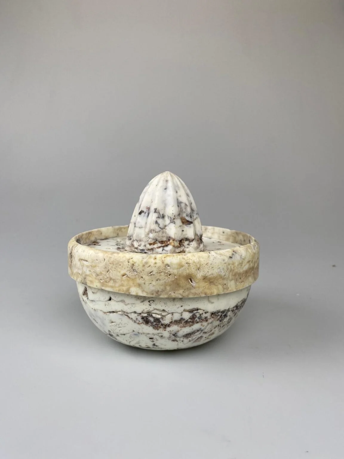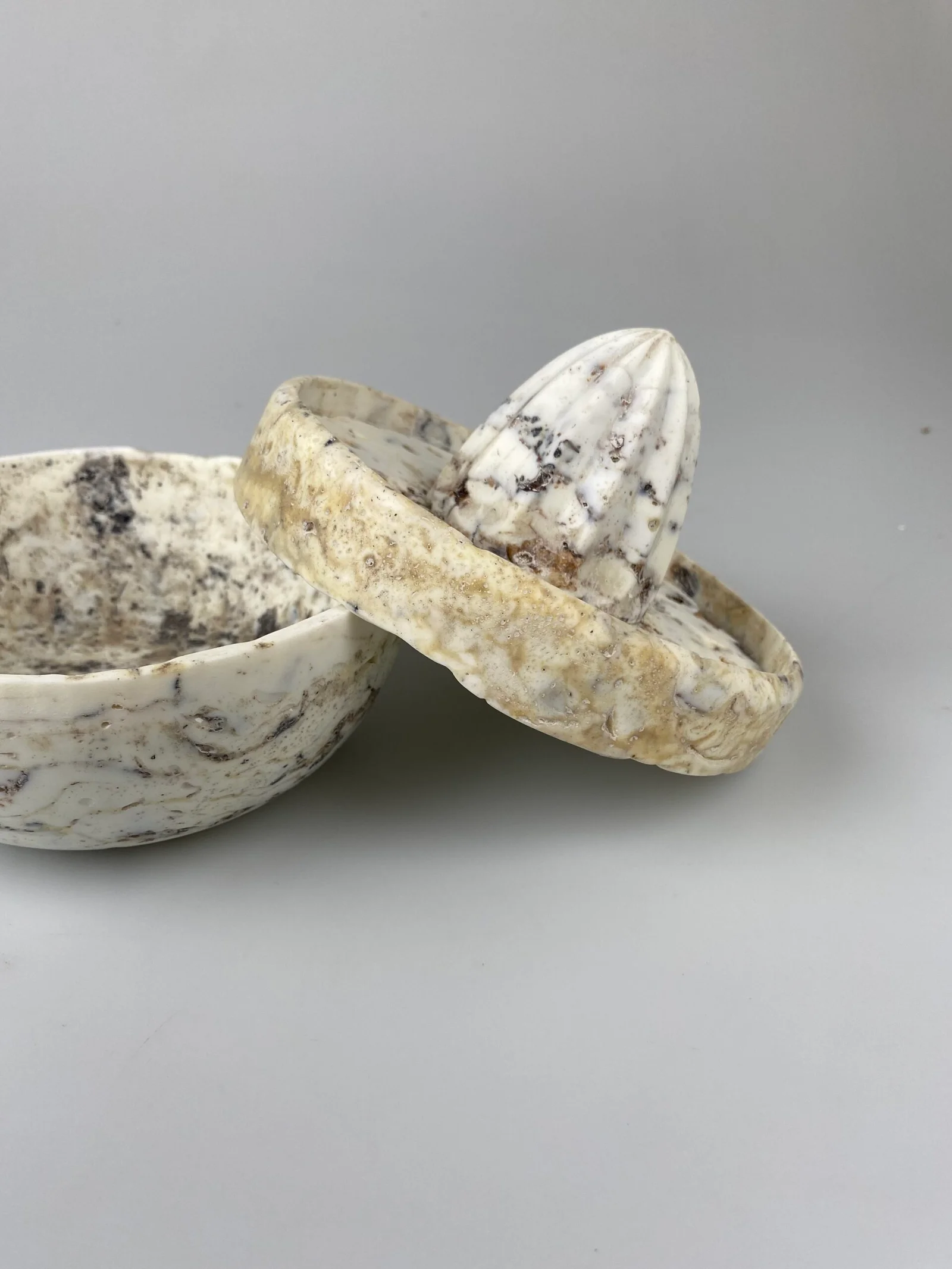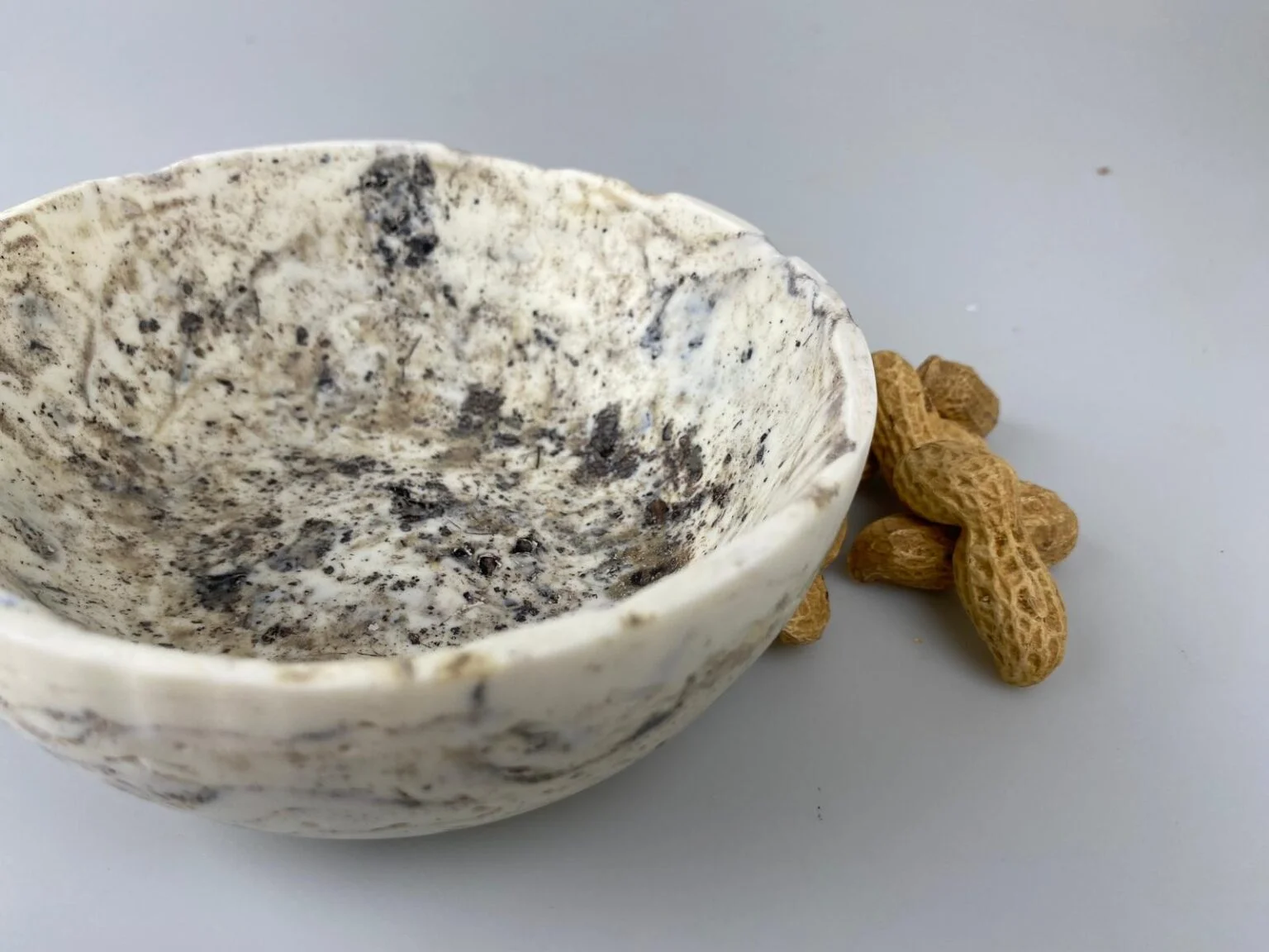 The project was an exploration of materials, aiming to combine one primary material with a perishable food waste to create a visually appealing and functional manual juicer. Consistency was key, with the chosen materials needing to be used across all three components.Ultimately, the final product was crafted from polystyrene and peanut shells. White polystyrene spoons were melted with crushed peanut shells then added and pressed onto the melted plastic. The heat caused the peanut shells to darken, creating a striking marbled pattern when combined with the white spoons. Additionally, the fibrous nature of the peanut shells reinforced the polystyrene, resulting in a more durable and damage-resistant final product