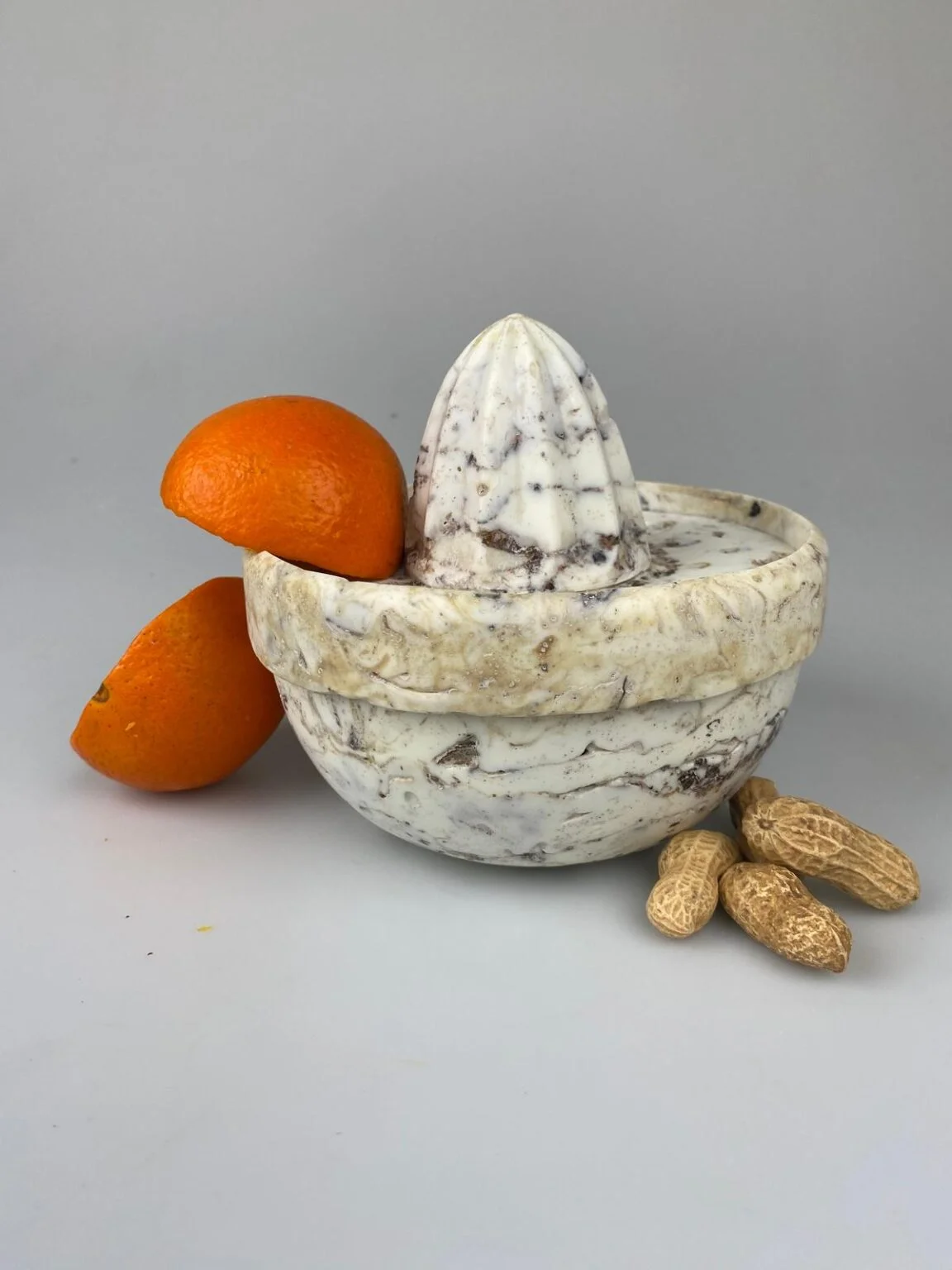 The project was an exploration of materials, aiming to combine one primary material with a perishable food waste to create a visually appealing and functional manual juicer. Consistency was key, with the chosen materials needing to be used across all three components.Ultimately, the final product was crafted from polystyrene and peanut shells. White polystyrene spoons were melted with crushed peanut shells then added and pressed onto the melted plastic. The heat caused the peanut shells to darken, creating a striking marbled pattern when combined with the white spoons. Additionally, the fibrous nature of the peanut shells reinforced the polystyrene, resulting in a more durable and damage-resistant final product
