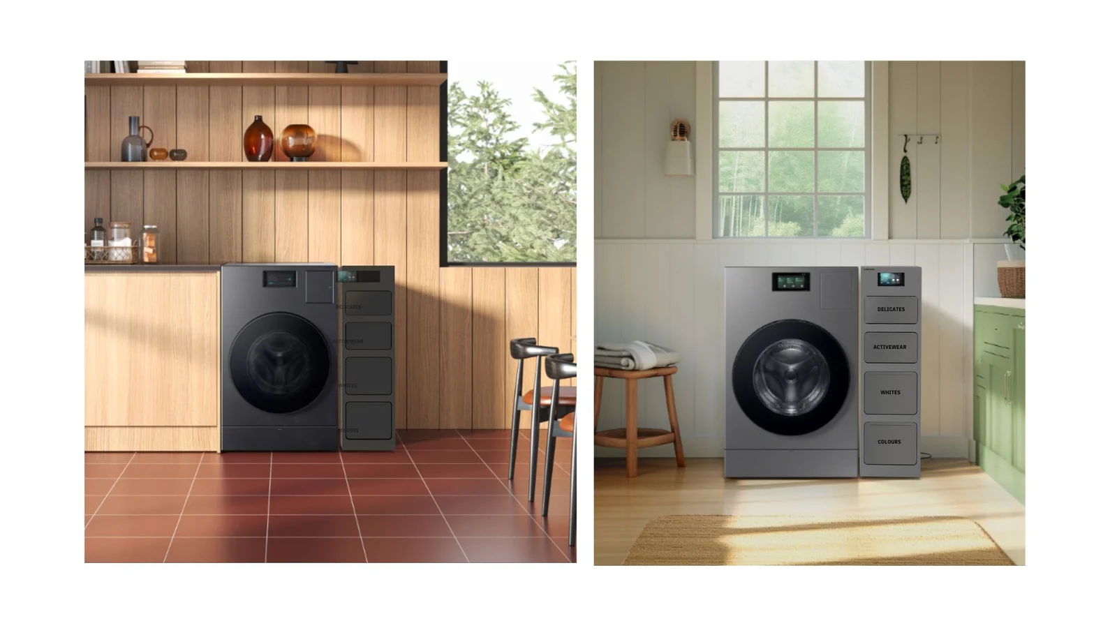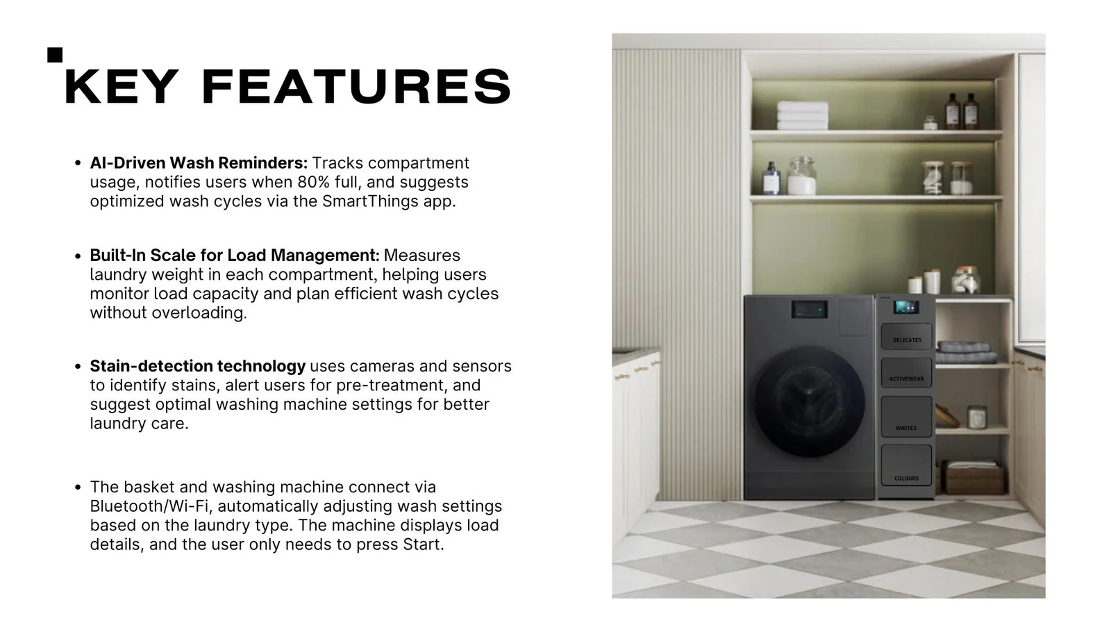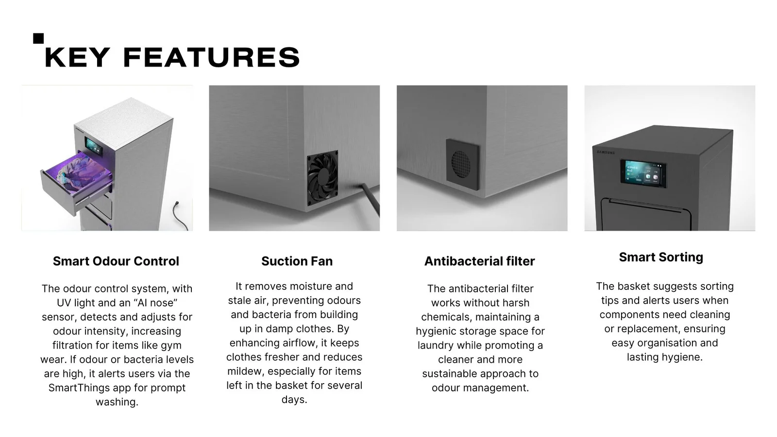 I worked with Samsung on a project aimed at reimagining home appliances to resonate with the evolving lifestyles and values of Gen Z as they come of age as homeowners. Through initial face-to-face interviews, I engaged with individuals living alone or in small households, delving into their laundry habits and pain points. These conversations revealed key insights: single or couple households often struggle with piling up laundry until a full load is feasible, but certain items like undergarments or gym wear require immediate washing. I saw this as an opportunity to create a smart solution to prevent odor, organize frequent-use items, and optimize wash loads would streamline laundry routines and enhance efficiency.
