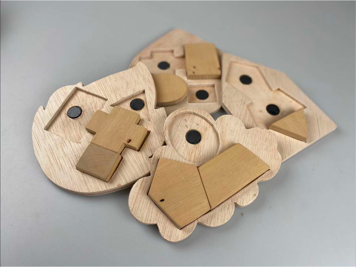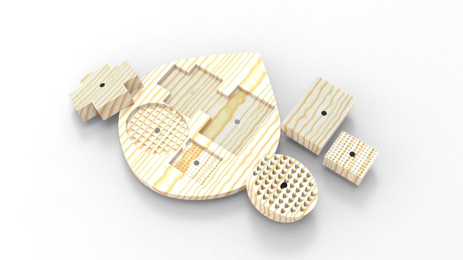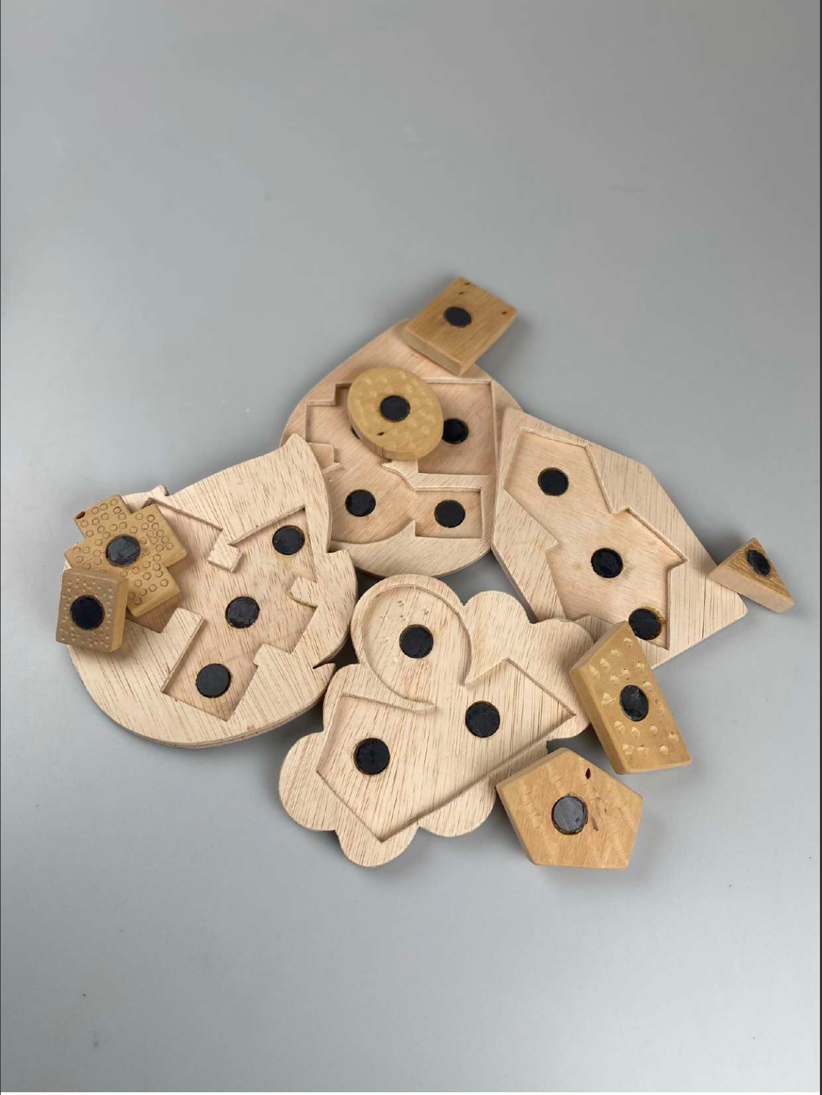 Tactual Twist is an innovative wooden puzzle that introduces seven distinct geometrical shapes adorned with unique textures, allowing visually impaired toddlers aged 2 and above to explore different surfaces through a tactile playground. It offers four captivating layouts – Cloud, Fire, Teardrop, and Hut – representing familiar shapes in the world, each layout telling a sensory story. Beyond conventional play, Tactual Twist incorporates shape and texture recognition and matching, making it an educational companion for early learning and sensory exploration. It promotes cognitive development through problem-solving and shape/texture matching, ensuring inclusive play for blind children.